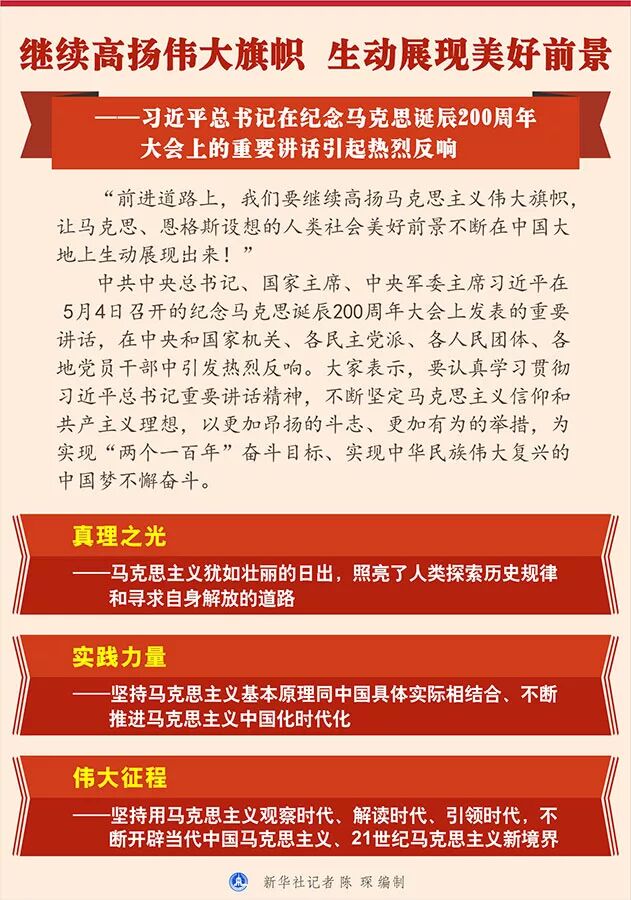 中共中央总书记、国家主席、中央军委主席习近平在5月4日召开的纪念马克思诞辰200周年大会上发表的重要讲话,在中央和国家机关、各民主党派、各人民团体、各地党员干部中引发热烈反响。大家表示,要认真学习贯彻习近平总书记重要讲话精神,不断坚定马克思主义信仰和共产主义理想,以更加昂扬的斗志、更加有为的举措,为实现“两个一百年”奋斗目标、实现中华民族伟大复兴的中国梦不懈奋斗。